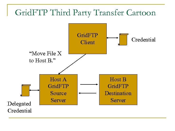 Grid. FTP Third Party Transfer Cartoon Grid. FTP Client Credential “Move File X to Host B. ” Delegated Credential Host A Grid. FTP Source Server Host B Grid. FTP Destination Server