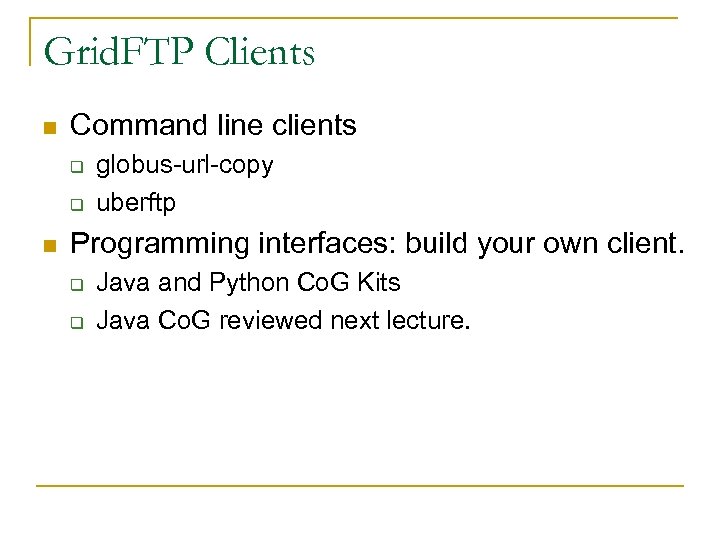 Grid. FTP Clients n Command line clients q q n globus-url-copy uberftp Programming interfaces: build your own client. q q Java and Python Co. G Kits Java Co. G reviewed next lecture.