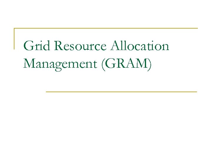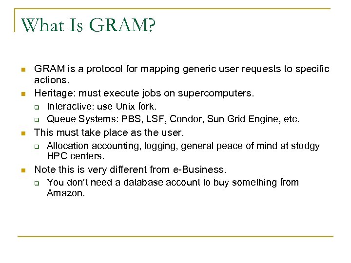 What Is GRAM? n n GRAM is a protocol for mapping generic user requests to specific actions. Heritage: must execute jobs on supercomputers. q Interactive: use Unix fork. q Queue Systems: PBS, LSF, Condor, Sun Grid Engine, etc. This must take place as the user. q Allocation accounting, logging, general peace of mind at stodgy HPC centers. Note this is very different from e-Business. q You don’t need a database account to buy something from Amazon.