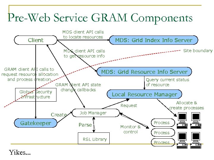 Pre-Web Service GRAM Components MDS client API calls to locate resources Client MDS: Grid Index Info Server Site boundary MDS client API calls to get resource info GRAM client API calls to MDS: request resource allocation and process creation. GRAM client API state change callbacks Globus Security Grid Resource Info Server Query current status of resource Local Resource Manager Infrastructure Request Create Gatekeeper Job Manager Parse RSL Library Yikes. . . Monitor & control Allocate & create processes Process