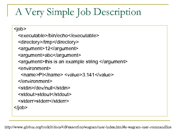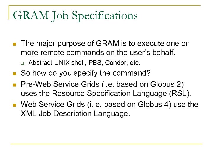GRAM Job Specifications n The major purpose of GRAM is to execute one or more remote commands on the user’s behalf. q n n n Abstract UNIX shell, PBS, Condor, etc. So how do you specify the command? Pre-Web Service Grids (i. e. based on Globus 2) uses the Resource Specification Language (RSL). Web Service Grids (i. e. based on Globus 4) use the XML Job Description Language.
