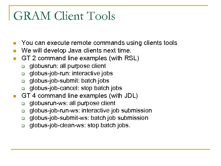 GRAM Client Tools n n You can execute remote commands using clients tools We will develop Java clients next time. GT 2 command line examples (with RSL) q globusrun: all purpose client q globus-job-run: interactive jobs q globus-job-submit: batch jobs q globus-job-cancel: stop batch jobs GT 4 command line examples (with JDL) q globusrun-ws: all purpose client q globus-job-run-ws: interactive job submission q globus-job-submit-ws: batch job submission q globus-job-clean-ws: stop batch jobs.