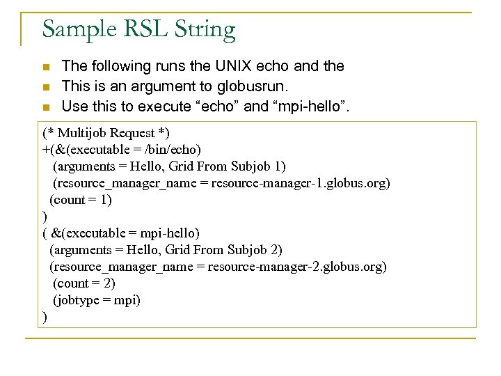 Sample RSL String n n n The following runs the UNIX echo and the This is an argument to globusrun. Use this to execute “echo” and “mpi-hello”. (* Multijob Request *) +(&(executable = /bin/echo) (arguments = Hello, Grid From Subjob 1) (resource_manager_name = resource-manager-1. globus. org) (count = 1) ) ( &(executable = mpi-hello) (arguments = Hello, Grid From Subjob 2) (resource_manager_name = resource-manager-2. globus. org) (count = 2) (jobtype = mpi) )