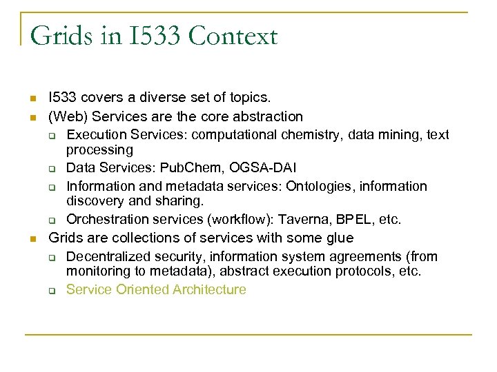 Grids in I 533 Context n n n I 533 covers a diverse set of topics. (Web) Services are the core abstraction q Execution Services: computational chemistry, data mining, text processing q Data Services: Pub. Chem, OGSA-DAI q Information and metadata services: Ontologies, information discovery and sharing. q Orchestration services (workflow): Taverna, BPEL, etc. Grids are collections of services with some glue q Decentralized security, information system agreements (from monitoring to metadata), abstract execution protocols, etc. q Service Oriented Architecture