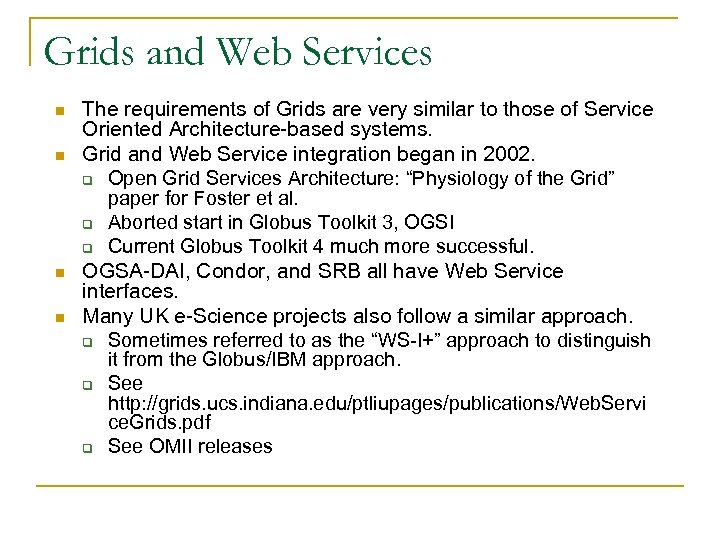 Grids and Web Services n n The requirements of Grids are very similar to those of Service Oriented Architecture-based systems. Grid and Web Service integration began in 2002. q Open Grid Services Architecture: “Physiology of the Grid” paper for Foster et al. q Aborted start in Globus Toolkit 3, OGSI q Current Globus Toolkit 4 much more successful. OGSA-DAI, Condor, and SRB all have Web Service interfaces. Many UK e-Science projects also follow a similar approach. q Sometimes referred to as the “WS-I+” approach to distinguish it from the Globus/IBM approach. q See http: //grids. ucs. indiana. edu/ptliupages/publications/Web. Servi ce. Grids. pdf q See OMII releases