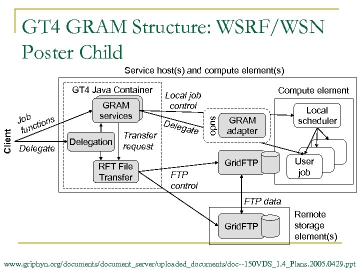 GT 4 GRAM Structure: WSRF/WSN Poster Child Job tions func Delegate GT 4 Java Container GRAM services Delegation Transfer request RFT File Transfer Compute element Local job control Deleg ate sudo Client Service host(s) and compute element(s) GRAM adapter Grid. FTP control Local scheduler User job FTP data Grid. FTP Remote storage element(s) www. griphyn. org/documents/document_server/uploaded_documents/doc--150 VDS_1. 4_Plans. 2005. 0429. ppt