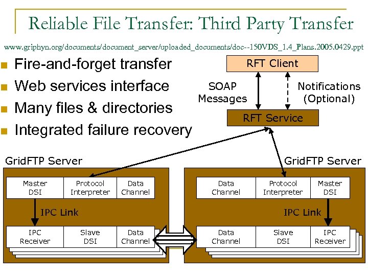Reliable File Transfer: Third Party Transfer www. griphyn. org/documents/document_server/uploaded_documents/doc--150 VDS_1. 4_Plans. 2005. 0429. ppt n n Fire-and-forget transfer Web services interface Many files & directories Integrated failure recovery RFT Client SOAP Messages RFT Service Grid. FTP Server Master DSI Protocol Interpreter Grid. FTP Server Data Channel IPC Link IPC Receiver Notifications (Optional) Protocol Interpreter Master DSI IPC Link Slave DSI Data Channel Slave DSI IPC Receiver