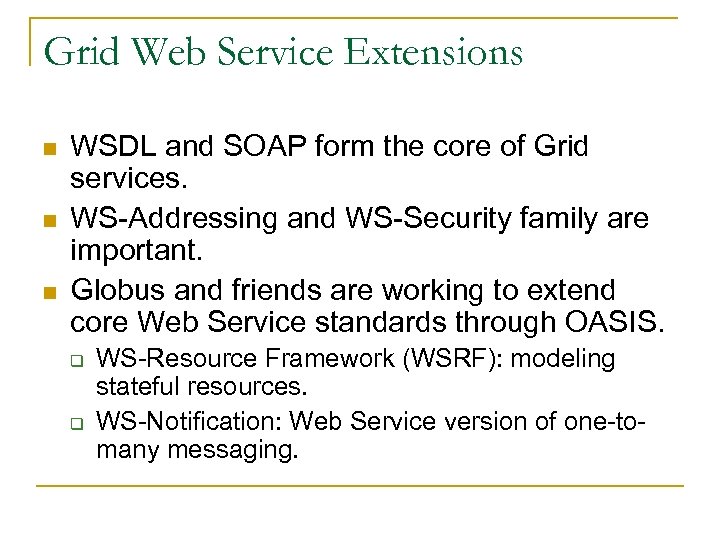 Grid Web Service Extensions n n n WSDL and SOAP form the core of Grid services. WS-Addressing and WS-Security family are important. Globus and friends are working to extend core Web Service standards through OASIS. q q WS-Resource Framework (WSRF): modeling stateful resources. WS-Notification: Web Service version of one-tomany messaging.