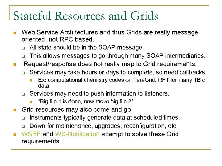Stateful Resources and Grids n n Web Service Architectures and thus Grids are really message oriented, not RPC based. q All state should be in the SOAP message. q This allows messages to go through many SOAP intermediaries. Request/response does not really map to Grid requirements. q Services may take hours or days to complete, so need callbacks. n q Services may need to push information to listeners. n n n Ex: computational chemistry codes on Tera. Grid, RFT for many TB of data. “Big file 1 is done, now move big file 2” Grid resources may also come and go. q Instruments typically generate data at scheduled times. q Down for maintenance, upgrades, reconfiguration, etc. WSRF and WS-Notification attempt to solve these Grid requirements.