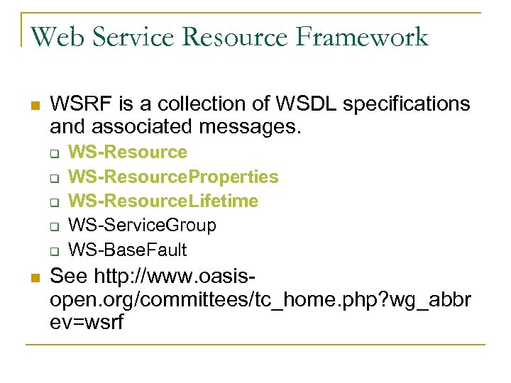 Web Service Resource Framework n WSRF is a collection of WSDL specifications and associated messages. q q q n WS-Resource. Properties WS-Resource. Lifetime WS-Service. Group WS-Base. Fault See http: //www. oasisopen. org/committees/tc_home. php? wg_abbr ev=wsrf