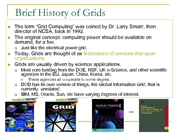 Brief History of Grids n n The term “Grid Computing” was coined by Dr. Larry Smarr, then director of NCSA, back in 1992. The original concept: computing power should be available on demand, for a fee. q n n Just like the electrical power grid. Today, Grids are thought of as federations of services that span organizations. Grids are usually driven by science applications. q Most core funding from the DOE, NSF, UK e-Science, and other scientific agencies in the EU, Japan, China, Korea, etc. n q q These agencies all cooperate to some degree. DOD has its own version of things, the Global Information Grid, that is currently unrelated. IBM, MS, Oracle, Sun, etc have varying degrees of interest. .