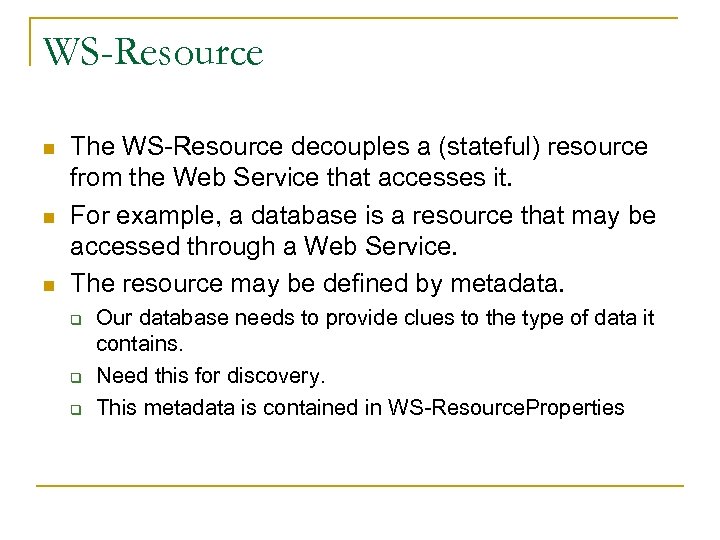 WS-Resource n n n The WS-Resource decouples a (stateful) resource from the Web Service that accesses it. For example, a database is a resource that may be accessed through a Web Service. The resource may be defined by metadata. q q q Our database needs to provide clues to the type of data it contains. Need this for discovery. This metadata is contained in WS-Resource. Properties