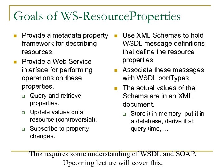 Goals of WS-Resource. Properties n n Provide a metadata property framework for describing resources. Provide a Web Service interface for performing operations on these properties. q q q Query and retrieve properties. Update values on a resource (controversial). Subscribe to property changes. n n n Use XML Schemas to hold WSDL message definitions that define the resource properties. Associate these messages with WSDL port. Types. The actual values of the Schema are in an XML document. q Store it in memory, put it in a database, derive it at query time, . . . This requires some understanding of WSDL and SOAP. Upcoming lecture will cover this.