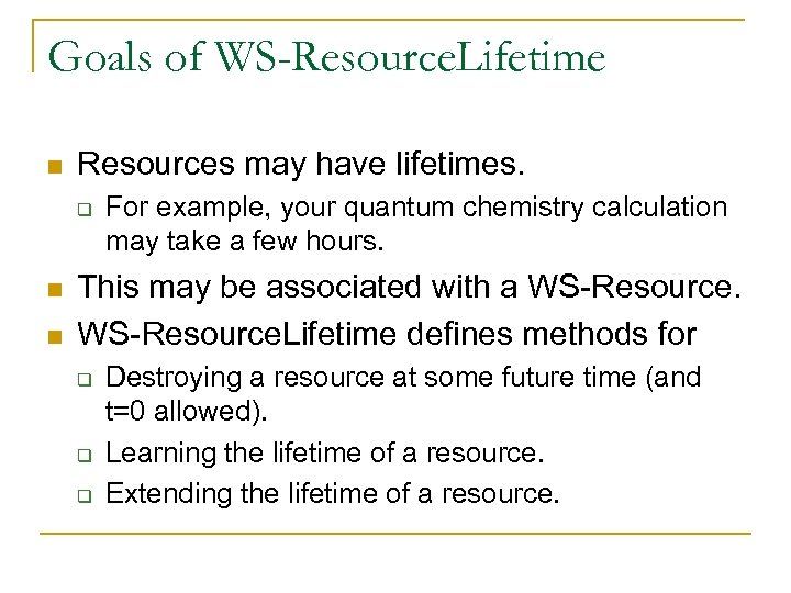 Goals of WS-Resource. Lifetime n Resources may have lifetimes. q n n For example, your quantum chemistry calculation may take a few hours. This may be associated with a WS-Resource. Lifetime defines methods for q q q Destroying a resource at some future time (and t=0 allowed). Learning the lifetime of a resource. Extending the lifetime of a resource.