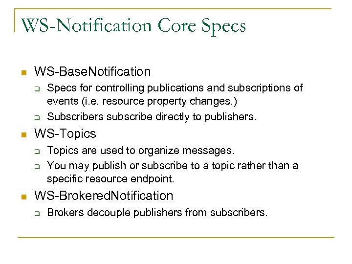 WS-Notification Core Specs n WS-Base. Notification q q n WS-Topics q q n Specs for controlling publications and subscriptions of events (i. e. resource property changes. ) Subscribers subscribe directly to publishers. Topics are used to organize messages. You may publish or subscribe to a topic rather than a specific resource endpoint. WS-Brokered. Notification q Brokers decouple publishers from subscribers.