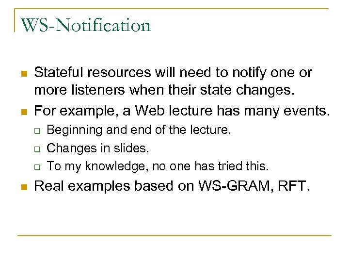 WS-Notification n n Stateful resources will need to notify one or more listeners when their state changes. For example, a Web lecture has many events. q q q n Beginning and end of the lecture. Changes in slides. To my knowledge, no one has tried this. Real examples based on WS-GRAM, RFT.