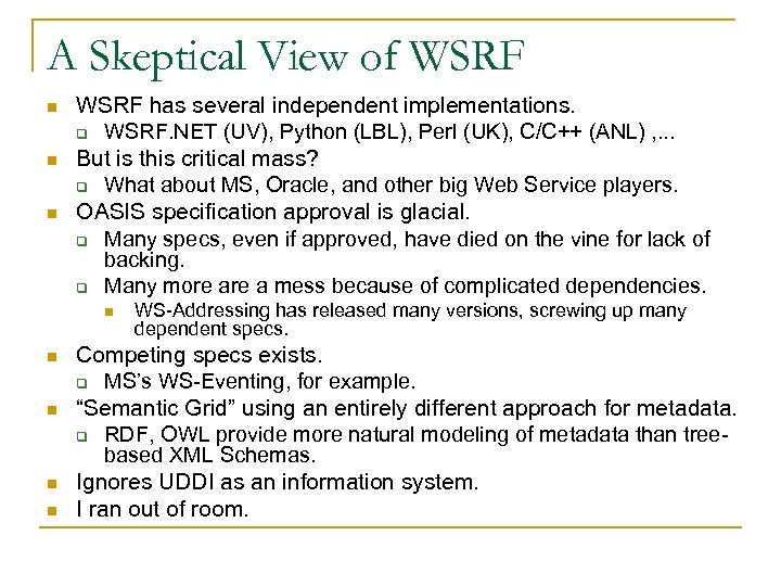 A Skeptical View of WSRF n n n WSRF has several independent implementations. q WSRF. NET (UV), Python (LBL), Perl (UK), C/C++ (ANL) , . . . But is this critical mass? q What about MS, Oracle, and other big Web Service players. OASIS specification approval is glacial. q Many specs, even if approved, have died on the vine for lack of backing. q Many more a mess because of complicated dependencies. n n n WS-Addressing has released many versions, screwing up many dependent specs. Competing specs exists. q MS’s WS-Eventing, for example. “Semantic Grid” using an entirely different approach for metadata. q RDF, OWL provide more natural modeling of metadata than treebased XML Schemas. Ignores UDDI as an information system. I ran out of room.