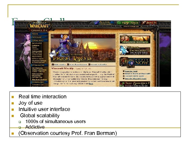 Future Challenges n n Real time interaction Joy of use Intuitive user interface Global scalability q q n 1000 s of simultaneous users Addictive (Observation courtesy Prof. Fran Berman)