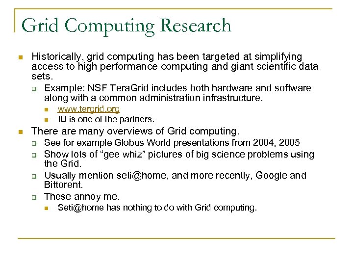 Grid Computing Research n Historically, grid computing has been targeted at simplifying access to high performance computing and giant scientific data sets. q Example: NSF Tera. Grid includes both hardware and software along with a common administration infrastructure. n n n www. tergrid. org IU is one of the partners. There are many overviews of Grid computing. q q See for example Globus World presentations from 2004, 2005 Show lots of “gee whiz” pictures of big science problems using the Grid. Usually mention seti@home, and more recently, Google and Bittorent. These annoy me. n Seti@home has nothing to do with Grid computing.