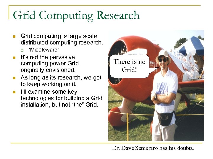 Grid Computing Research n Grid computing is large scale distributed computing research. q n n n “Middleware” It’s not the pervasive computing power Grid originally envisioned. As long as its research, we get to keep working on it. I’ll examine some key technologies for building a Grid installation, but not “the” Grid. There is no Grid! Dr. Dave Semeraro has his doubts.