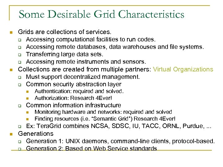 Some Desirable Grid Characteristics n n Grids are collections of services. q Accessing computational facilities to run codes. q Accessing remote databases, data warehouses and file systems. q Transferring large data sets. q Accessing remote instruments and sensors. Collections are created from multiple partners: Virtual Organizations q Must support decentralized management. q Common security abstraction layer n n q Common information infrastructure n n q n Authentication: required and solved. Authorization: Research 4 Ever! Monitoring hardware and networks: required and solved Finding resources (i. e. “Semantic Grid”) Research 4 Ever! Ex: Tera. Grid combines NCSA, SDSC, IU, TACC, ORNL, Purdue, . . . Generations q Generation 1: UNIX daemons, command-line clients, protocol-based. q Generation 2: Based on Web Service standards