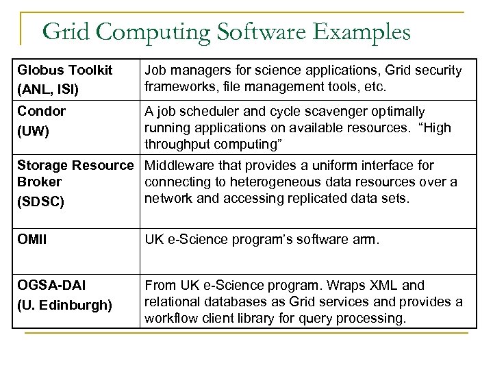 Grid Computing Software Examples Globus Toolkit (ANL, ISI) Job managers for science applications, Grid security frameworks, file management tools, etc. Condor (UW) A job scheduler and cycle scavenger optimally running applications on available resources. “High throughput computing” Storage Resource Middleware that provides a uniform interface for Broker connecting to heterogeneous data resources over a network and accessing replicated data sets. (SDSC) OMII UK e-Science program’s software arm. OGSA-DAI (U. Edinburgh) From UK e-Science program. Wraps XML and relational databases as Grid services and provides a workflow client library for query processing.