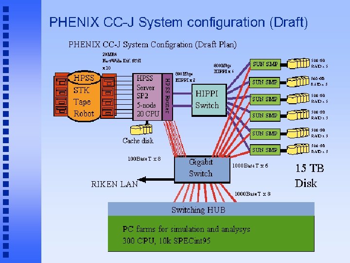 PHENIX CC-J ü The PHENIX CC-J at RIKEN is intended to serve as the main site of computing for PHENIX simulations, a regional Asia computing center for PHENIX, and as a center for SPIN physics analysis. ü Network switches required to connect HPSS servers, the SMP data servers, and the CPU farms at RCF. ü In order to exchange data between RCF and CC-J, a proper bandwidth of the WAN between RCF and CC-J is required. ü CC-J has CPU farms of 10 K SPECint 95, tape storage of 100 TB, disk storage of 15 TB, tape I/O of 100 MB/sec, disk I/O of 600 MB/sec, and 6 SUN SMP data server units.