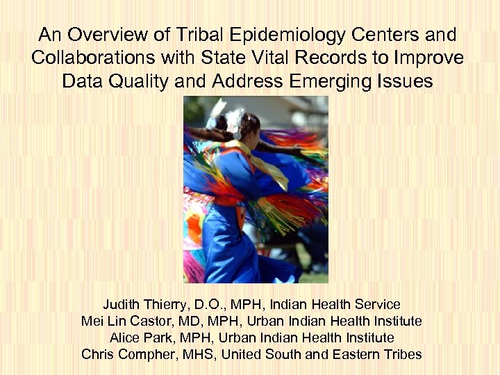 An Overview of Tribal Epidemiology Centers and Collaborations with State Vital Records to Improve Data Quality and Address Emerging Issues Judith Thierry, D. O. , MPH, Indian Health Service Mei Lin Castor, MD, MPH, Urban Indian Health Institute Alice Park, MPH, Urban Indian Health Institute Chris Compher, MHS, United South and Eastern Tribes