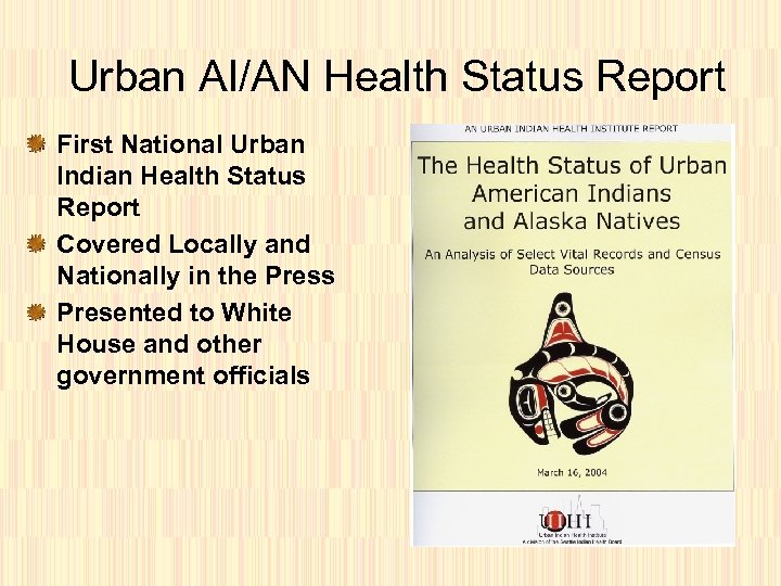 Urban AI/AN Health Status Report First National Urban Indian Health Status Report Covered Locally and Nationally in the Press Presented to White House and other government officials