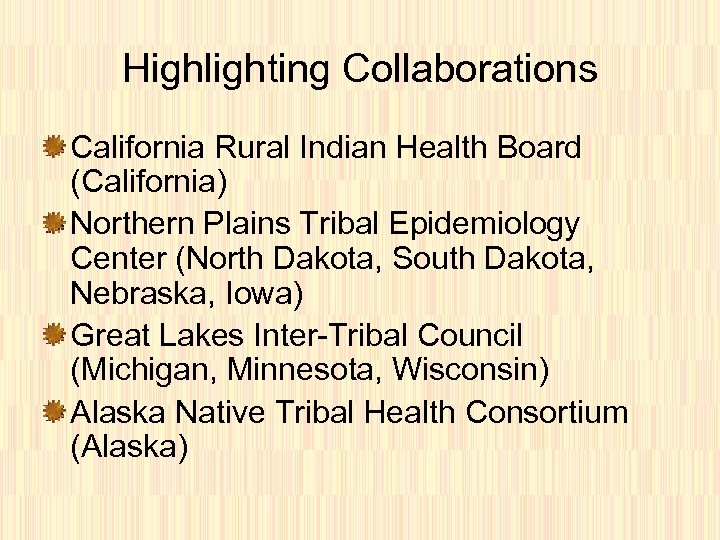 Highlighting Collaborations California Rural Indian Health Board (California) Northern Plains Tribal Epidemiology Center (North Dakota, South Dakota, Nebraska, Iowa) Great Lakes Inter-Tribal Council (Michigan, Minnesota, Wisconsin) Alaska Native Tribal Health Consortium (Alaska)