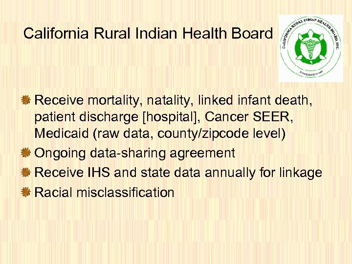 California Rural Indian Health Board Receive mortality, natality, linked infant death, patient discharge [hospital], Cancer SEER, Medicaid (raw data, county/zipcode level) Ongoing data-sharing agreement Receive IHS and state data annually for linkage Racial misclassification