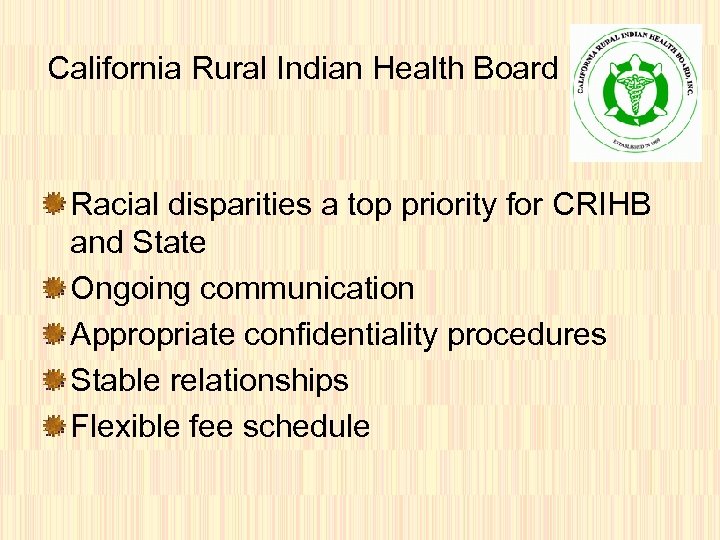 California Rural Indian Health Board Racial disparities a top priority for CRIHB and State Ongoing communication Appropriate confidentiality procedures Stable relationships Flexible fee schedule