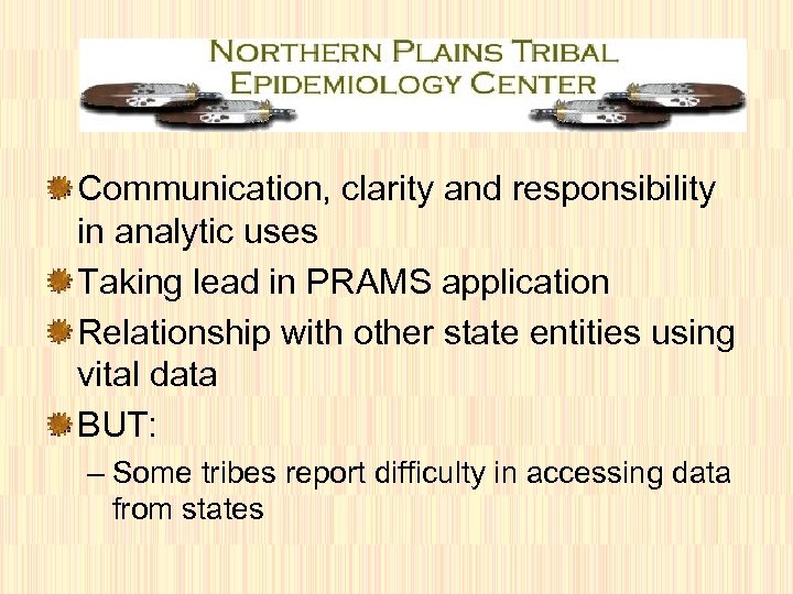 Communication, clarity and responsibility in analytic uses Taking lead in PRAMS application Relationship with other state entities using vital data BUT: – Some tribes report difficulty in accessing data from states