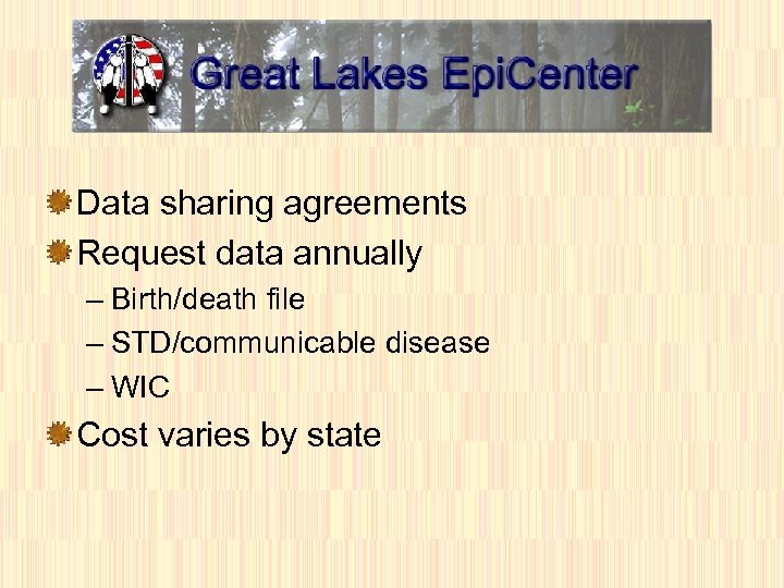Data sharing agreements Request data annually – Birth/death file – STD/communicable disease – WIC Cost varies by state