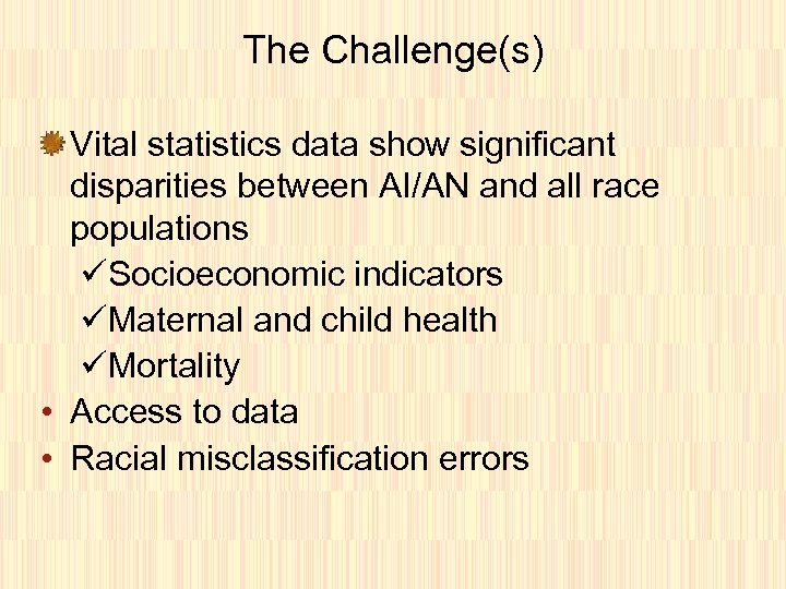 The Challenge(s) Vital statistics data show significant disparities between AI/AN and all race populations üSocioeconomic indicators üMaternal and child health üMortality • Access to data • Racial misclassification errors