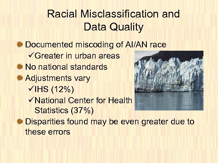 Racial Misclassification and Data Quality Documented miscoding of AI/AN race üGreater in urban areas No national standards Adjustments vary üIHS (12%) üNational Center for Health Statistics (37%) Disparities found may be even greater due to these errors