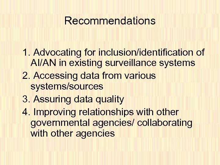 Recommendations 1. Advocating for inclusion/identification of AI/AN in existing surveillance systems 2. Accessing data from various systems/sources 3. Assuring data quality 4. Improving relationships with other governmental agencies/ collaborating with other agencies