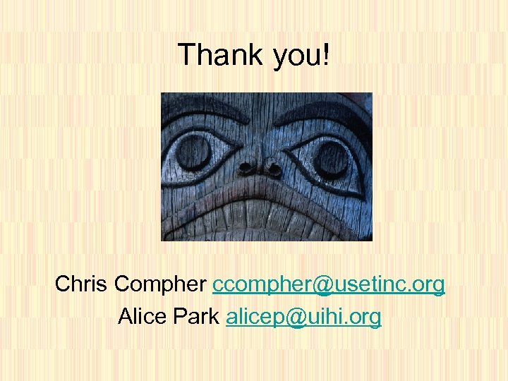 Thank you! Chris Compher ccompher@usetinc. org Alice Park alicep@uihi. org