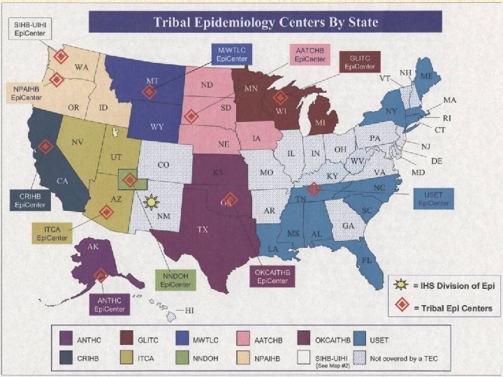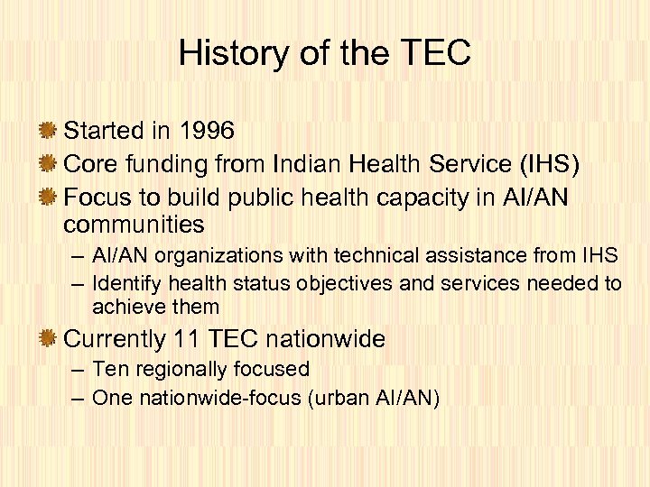 History of the TEC Started in 1996 Core funding from Indian Health Service (IHS) Focus to build public health capacity in AI/AN communities – AI/AN organizations with technical assistance from IHS – Identify health status objectives and services needed to achieve them Currently 11 TEC nationwide – Ten regionally focused – One nationwide-focus (urban AI/AN)