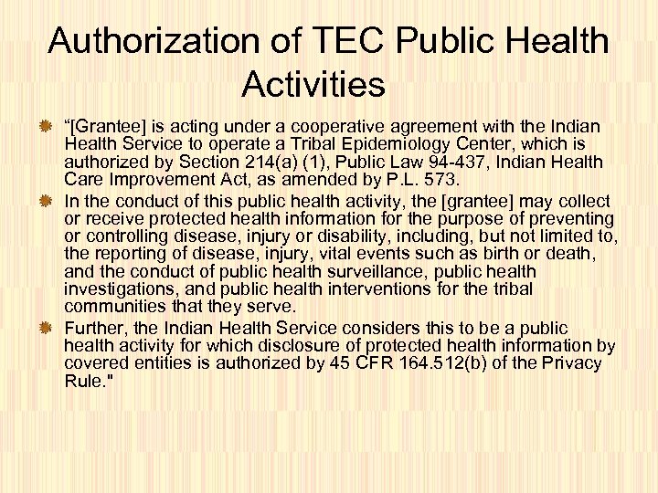 Authorization of TEC Public Health Activities “[Grantee] is acting under a cooperative agreement with the Indian Health Service to operate a Tribal Epidemiology Center, which is authorized by Section 214(a) (1), Public Law 94 -437, Indian Health Care Improvement Act, as amended by P. L. 573. In the conduct of this public health activity, the [grantee] may collect or receive protected health information for the purpose of preventing or controlling disease, injury or disability, including, but not limited to, the reporting of disease, injury, vital events such as birth or death, and the conduct of public health surveillance, public health investigations, and public health interventions for the tribal communities that they serve. Further, the Indian Health Service considers this to be a public health activity for which disclosure of protected health information by covered entities is authorized by 45 CFR 164. 512(b) of the Privacy Rule. "
