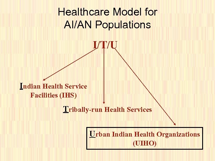 Healthcare Model for AI/AN Populations I/T/U Indian Health Service Facilities (IHS) Tribally-run Health Services Urban Indian Health Organizations (UIHO)