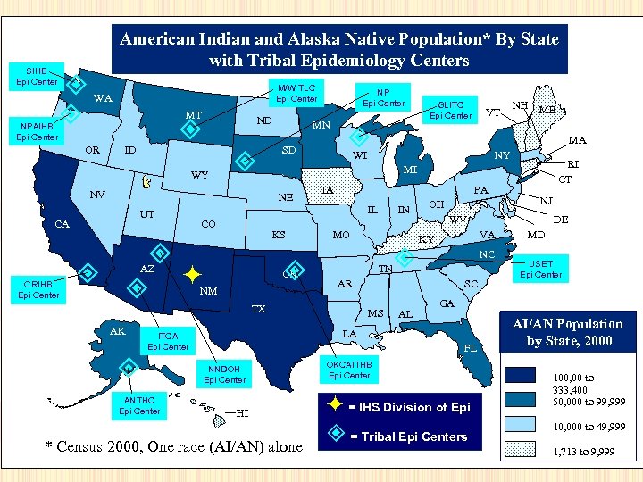 SIHB Epi Center NPAIHB Epi Center American Indian and Alaska Native Population* By State with Tribal Epidemiology Centers ² WA ² OR M/W TLC Epi Center MT ND ² ID WY ² NV CRIHB Epi Center MN UT KS ² AZ ² öNM ² ² OK ANTHC Epi Center ME NY PA OH IN RI CT MO ² TN NC AR SC AL HI * Census 2000, One race (AI/AN) alone MD USET Epi Center GA FL NNDOH Epi Center DE VA KY MS NJ WV LA ITCA Epi Center ± NH MA IA TX AK VT MI IL CO GLITC Epi Center ² WI SD NE CA NP Epi Center OKCAITHB Epi Center ö = IHS Division of Epi ² = Tribal Epi Centers AI/AN Population by State, 2000 100, 00 to 333, 400 50, 000 to 99, 999 10, 000 to 49, 999 1, 713 to 9, 999