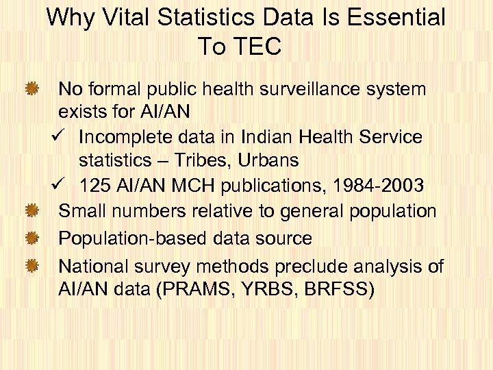 Why Vital Statistics Data Is Essential To TEC No formal public health surveillance system exists for AI/AN ü Incomplete data in Indian Health Service statistics – Tribes, Urbans ü 125 AI/AN MCH publications, 1984 -2003 Small numbers relative to general population Population-based data source National survey methods preclude analysis of AI/AN data (PRAMS, YRBS, BRFSS)