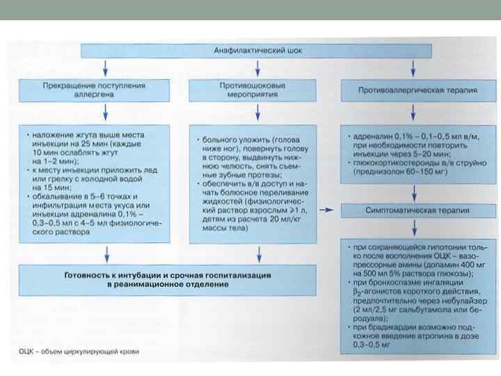 Лечение Неотложная медицинская помощь при анафилактическом шоке должна быть направлена на: 1) купирование острых нарушений функций кровообращения и дыхания; 2) компенсацию адренокортикальной недостаточности; 3) нейтрализацию и ингибицию в крови биологически активных веществ реакции антиген антитело; 4) блокирование поступления лекарства аллергена в кровоток; 5) поддержание жизненно важных функций организма, реанимационные мероприятия при тяжелом состоянии или клинической смерти.