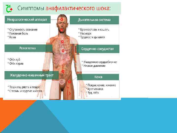 Шок симптомдарының сипаттамасы (типті): - тері жабындысының түсі өзгереді (тері қызаруы немесе бозғылдық, цианоз); - әр түрлі экзантемалар; - қабақ, бет, мұрын шырышының ісінуі; - суық тер; - түшкіру, жөтел, қышу сезімі; - жас ағу; - құсу; - аяқ-қолдың клоникалық тырысулары ( кейде тырысулық құлау); - қозғалыс бұзылыстары; - «өлімнен қорқу» ; - еріксіз зәр, нәжіс, газ бөлінуі.