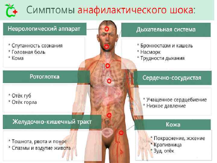 Асфиксиялық вариантында басты орын ЖТЖ, ол көмей ісінумен, бронхтардың спазмымен, бронхтардың шырышты қабатының ісінуімен немесе өкпе ісінумен байланысты болып табылады. Ересектерде респираторлы дистресс – синдромы айқын гипоксияның дамуымен жүреді. АШ-тың церебральды варианты сирек оқшауланып анықталады, ОЖЖ жағынан бұзылыстармен сипатталады: қозғыштық, есінен тану, жедел ісіну жəне ми ісігі, эпилептикалық статус, тыныс жəне жүрек тоқтауы. АШ-тың абдоминальды вариантында бірінші орынға «жедел іш» симптомы: іштің барлық аймағында немесе құрсақ үсті аймақта ауыру сезімі, құсу, үлкен дəретке шақырулар, жиі диагностикалық қателіктермен өтеді. Осы вариантында жиі операция жасалынады.