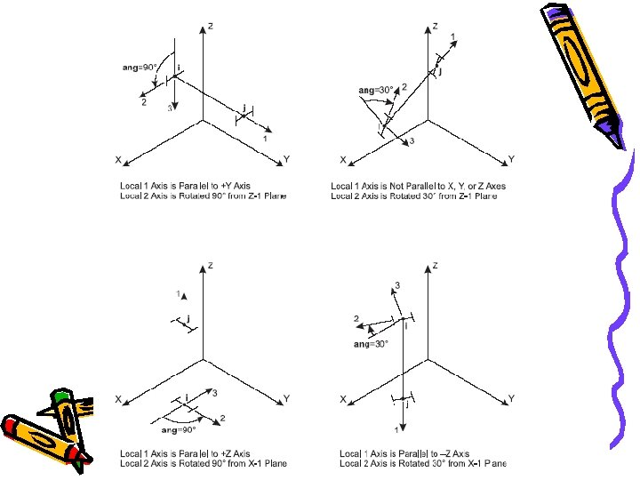 KOORDINAT LOKAL • Digunakan untuk menentukan potongan property, beban dan gaya-gaya keluaran. • Sumbu-sumbunya dinyatakan dengan simbol 1, 2 dan 3. • Sumbu 1 arahnya searah sumbu elemen, dua sumbu yang lain tegak lurus dengan elemen tersebut dan arahnya dapat ditentukan sendiri oleh pengguna.