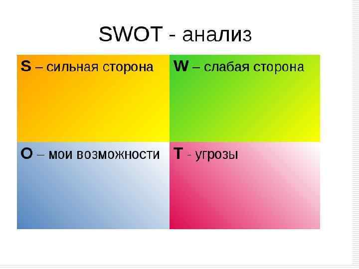 SWOT - анализ o o Поле СИВ показывает, какие сильные стороны необходимо использовать, чтобы получить отдачу от возможностей во внешней среде. Поле СЛВ показывает, за счет каких возможностей внешней среды организация сможет преодолеть имеющиеся слабости. Поле СИУ показывает, какие силы необходимо использовать организации для устранения угроз. Поле СЛУ показывает, от каких слабостей необходимо избавиться, чтобы попытаться предотвратить нависшую угрозу. Возможности Сильные стороны Слабые стороны Угрозы