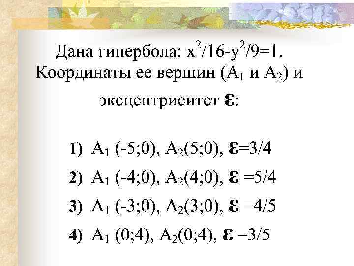 Выбрать уравнение гиперболы, представленной на рисунке: n n (x+2)2/4 -(y-1)2/9=1 (x-2)2/4 -(y+1)2/9=1 (x+1)2/9 -(y-2)2/4=1 (x-1)2/9 -(y+2)2/4=1 7