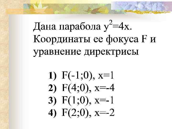 Множество всех точек плоскости, каждая из которых находится на одинаковом расстоянии от данной точки, называемой фокусом, и от данной прямой, называемой директрисой и не проходящей через фокус, есть: 1. окружность 2. гипербола 3 парабола 4. эллипс 15